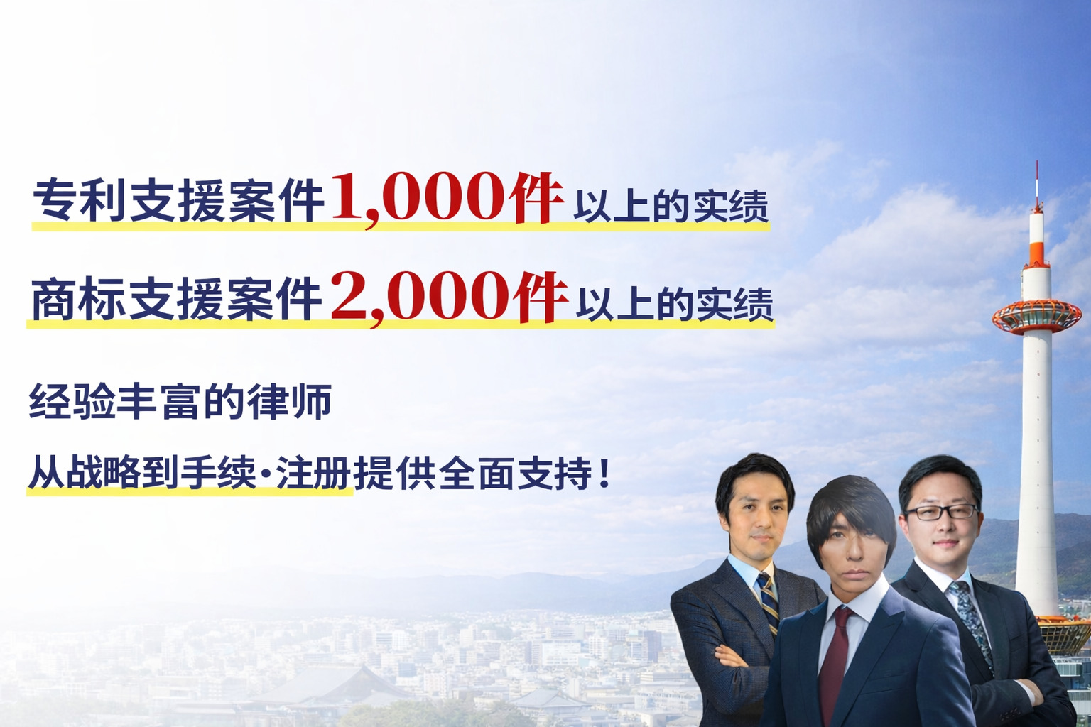 | 业绩(代表专利代理师) | 专利支持案例 1,000 件以上 商标申请代理 2,000 件以上 |